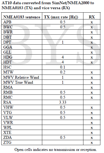 ![]() Das Simrad AT-10 Interface übersetzt folgende Datensätze von Simnet in NMEA 0183 und umgekehrt, wenn die Daten im System vorhanden sind. Simnet Eingang zum NMEA 0183 Ausgang: